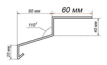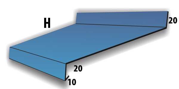 - Ширина верхней и нижней полок (плоскостей) составляет не менее 20 мм. В противном случае, верхнюю полку будет неудобно крепить к стене. Если нижняя полка будет усиливаться ребром жесткости, то к ширине отлива необходимо добавить еще 10-12 мм.