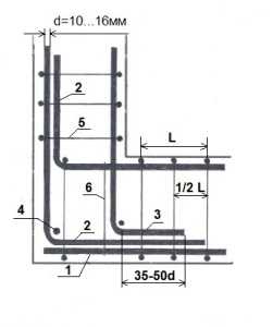 1 — горизонтальная арматура; 2 — нахлест; 3 — вертикальная арматура; 4 — поперечная арматура; 5 — дополнительная поперечная арматура; 6 — Г-образный хомут; d — диаметр стержня арматуры; 50= L 3/4 высоты сечения ленты фундамента