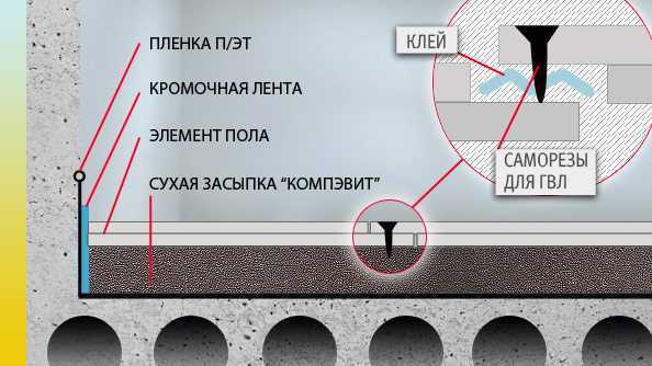 Маяками служат П-образные профили, которые укладывают на пол, переворачивая их вверх кромками, устанавливаются они по уровню. Засыпается наполнитель в получившиеся ячейки, выравнивается с помощью «правила», затем укладываются листы. Стыки проклеиваются клеем ПВА и стягиваются саморезами шагом в 20 см. На стыке со стенами кромка гипсоволоконных листов срезается.