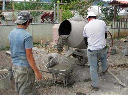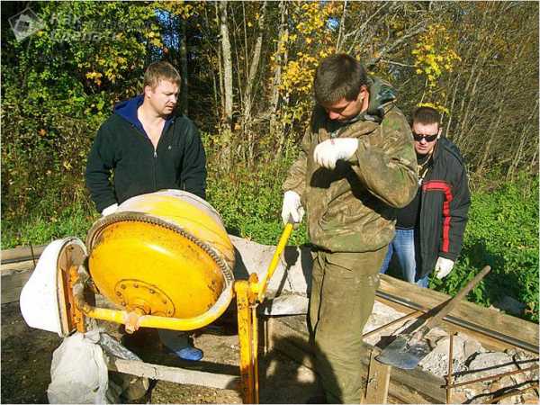 Для этого все подготовительные работы на местах замешивания бетона должны быть проведены заранее: водопровод или хотя бы шланг с возможностью перекрытия воды, песок и щебень в отдельных кучах, цемент в мешках и мерные емкости, обычно ведра. Если периметр здания большой, то чтобы не таскать ведра с бетоном далеко, можно подготовить два или три места для установки бетономешалки.