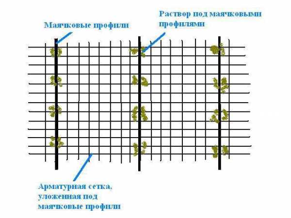 В первую очередь нужно провести разметку, т.е. разбить площадь на отрезки, их длина составит 1,5-2 м. Потом с помощью уровня и железной рейки ведется линия, ставятся маленькие столбы из раствора, на какие и будут крепиться направляющие. При монтаже направляющих важно смотреть, дабы их верхний краешек находился строго по нулевому уровню, в данном случае заливка будет сделана определенно по разметке, плоскость выйдет ровненькой.