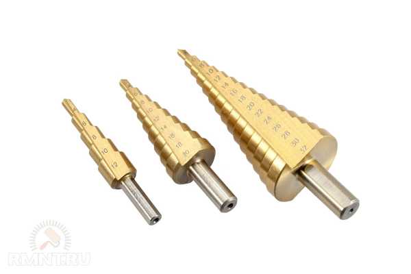 - Ступенчатые. Удобны тем, что одно сверло может быть использовано для создания отверстий различного диаметра. Применяются на листовых материалах.