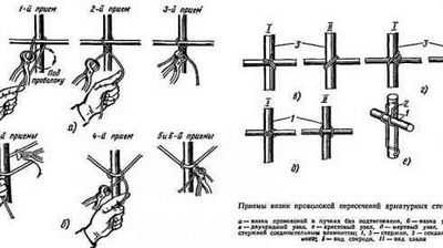 Для вязки элементов арматуры используют отрезки проволоки после термической обработки #8212; отжига, диаметром 0,8-1,0 мм, длиной до 100 мм. В зависимости от размера сечения элементов арматуры и места расположения узлов вязку различают на: простую, угловую, двухрядную, крестовую, двойную, мертвую.
