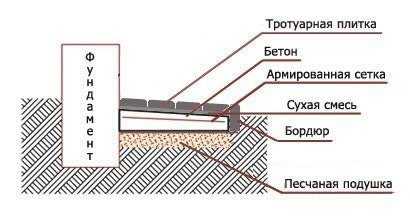 - настил обязан быть шире свеса крыши, на песчаных грунтах его ширина должна быть не меньше 60 см (на 25-30 см шире карниза дома), на пучинистых грунтах необходимо соблюдение ширины уже не менее 1 м, на некоторых просадочных грунтах и до 2 м. Чем шире это сооружение, тем надежнее отвод влаги, воды от фундамента здания;