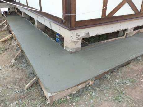 Оно может представлять собой бетонную или асфальтовую дорожку, проходящую по периметру здания и прилегающую вплотную к его наружным стенам, с обязательным уклоном в направлении от стен строения. Защитные свойства этой дорожки определяет ее конструкция и материал верхнего покрытия, а также уклон отмостки и ее ширина.