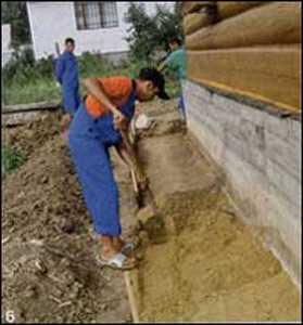 4. Железнение бетона – один из главных этапов устройства правильной отмостки дома. После укладки бетона необходимо провести его железнение – присыпать сухим цементом, который затирают при помощи мастерка. Эта процедура позволяет получить прочный водонипронецаемый слой. Поверхность завершенной отмостки следует покрыть влажной мешковиной и поддерживать уровень влаги в течение двух дней. После затвердевания бетона необходимо заделать шов между отмосткой и стеной дома, для чего подойдет битум или герметик.