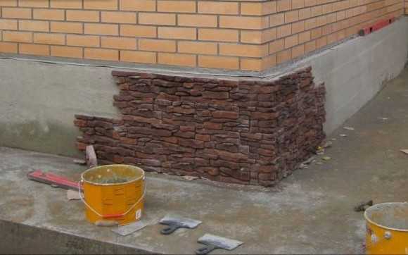 Если облицовывать цоколь искусственным камнем, то установка каркаса может не понадобиться, т.к. вес облицовки не критичный. Обычно, искусственный камень весит порядка 5- 15кг/м2. Искусственный камень устанавливают «мокрым» способом на раствор, как если бы крепили керамогранит.