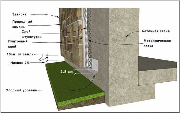 Армирование основы может выполняться как металлической сеткой, так и стекловолоконной, выбор зависит от веса облицовки - Когда конструкция фундамента имеет выпирающую за фасад форму, обязательно создание отлива.