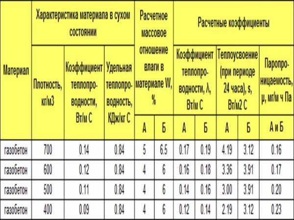 Очень часто в рекламных буклетах можно встретить значение коэффициента теплопроводности для марки D500, равным 0,1. Это не более чем маркетинговый ход. Данное значение либо намеренно округлено в меньшую сторону, либо просто предоставлено для абсолютно сухого состояния блока. В реальных эксплуатационных условиях теплоизоляционные свойства похуже – их значения приведены в графе расчётных коэффициентов. Буквами «А» и «Б» обозначается зона влажности, соответствующая месту строительства. Для побережий крупных водоёмов принимается зона «Б», для остальных мест, как правило, зона «А». Чем выше водонасыщение материала, тем хуже его теплоизоляционные свойства.
