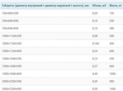 - если в работе будут задействованы кольца d0 м, высотой 0.8 м, объем одного изделия принимается за 0.63 м³;