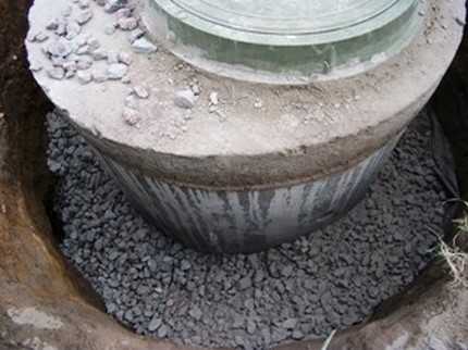 Достигая отметки соединительной трубы, жидкая часть переливается во второй колодец. Второй колодец имеет дренированное дно (отсутствует бетонная плита в днище — вместо нее щебеночная подушка).