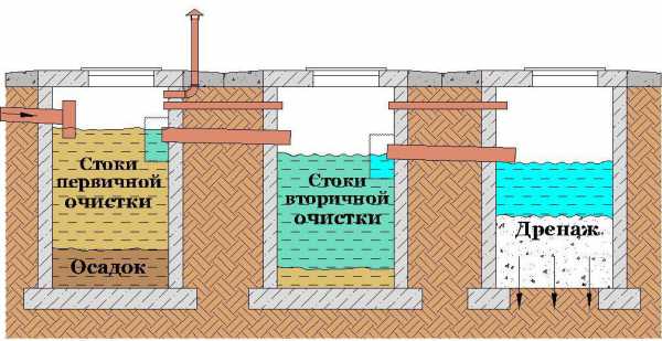 Каждая емкость отвечает за дальнейший этап очистки стоков. Чем больше емкостей, тем лучше очистка. Важно правильно рассчитать необходимое количество строений. Стандартный вариант — три элемента, но бывают специальные проекты, с меньшим количеством емкостей. Классическая схема септика из бетонных колец: