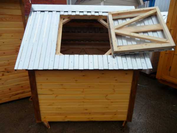 В этом случае есть где разыграться фантазии. Стилизовать крышку можно под имеющиеся строения. Например, обить её блок-хаузом или кровельным материалом, повторяющим кровлю основного здания, украсить декоративными элементами. С одной стороны двускатной крыши обязательно предусмотреть открывающуюся дверцу. Она может быть одно — или двустворчатой.