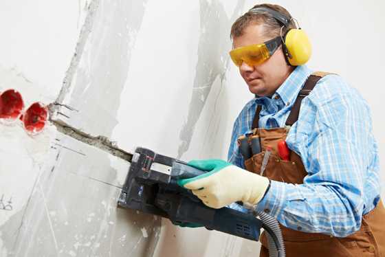 По заранее намеченным линиям с помощью перфоратора делаются отверстия глубиной 2-2,5 сантиметра на расстоянии 1-2 сантиметра друг от друга. После этого необходимо соединить отверстия между собой, таким образом, чтобы образовался сплошной канал. Сделать это можно с помощью обычного молотка и зубила, но поскольку этот способ очень громкий и сложный, лучше для этой цели воспользоваться все тем же перфоратором, переведя его в ударный режим и поместив сверло под углом к стене.