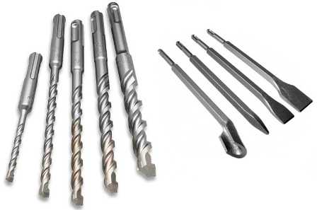 Основная оснастка для этого инструмента – бур. Однако предлагают к перфораторам и ряд других полезных приспособлений. Каковы они и какие задачи решают?