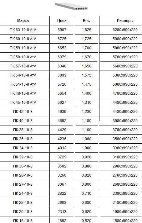 Благодаря тому, что состав перекрытия и размеры стандартизованы, политика предприятий направлена на сохранение стабильной цены. Средняя стоимость пустотных панелей приведена в таблице ниже.