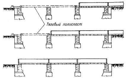 Рис. 114. Схема надвижки трех разрезных пролетных строений моста без устройства промежуточных опор