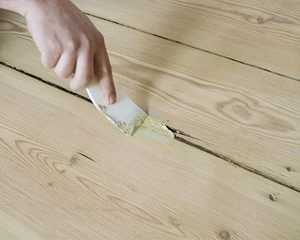 Устранение щелей и неровностей. С помощью монтажной пены замазываются все имеющиеся зазоры между досками. Заполненные пеной щели выравнивают при помощи шпатлевки на основе эпоксидной смолы. Этой шпатлевкой корректируются и все неровности деревянного настила.