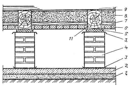 Делать стяжку по деревянному полу имеет смысл, если лаги пола стоят на высоких кирпичных столбах. Высота таких столбов может достигать 30-40 см (и более) и заменить их на стяжку не представляется возможным. Два фото схем таких полов вы можете смотреть ниже.