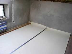 После высыхания шпаклевки на деревянное основание стелется полиэтилен толщиной 200 микрон. Полиэтилен стелется с напуском на стены 10-15 см. Два соседних куска полиэтилена стелятся внахлест 20-25 см. Стык между кусками полиэтилена заклейте не промокающим монтажным скотчем. Скотчем же приклейте напуски к стене.