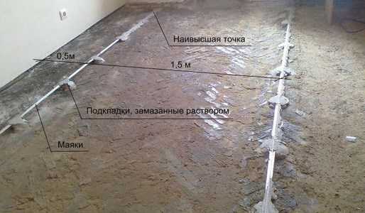 Проводить сооружение маяков нужно очень аккуратно, не применяя ни гвозди, ни саморезы. Для этого лучше использовать раствор, соответствующий составу стяжки. Для этого расположите полоски раствора таким образом, чтобы расстояние между стеной и так называемой грядкой было не больше 30 см, а между собой – не более метра двадцати.