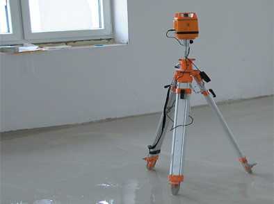 Несвязанная стяжка ровнителем должна быть более 30 мм. Для деревянного пола выберете 50 – 60 мм. Уровень стяжки лучше вымерить лазерным уровнем. Если помещение совсем небольшое, достаточно строительного уровня. По уровню лазера нанесите линию стяжки по стене и выставите маяки реперы (уровни на ножках) по поверхности пола.