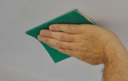 - После высыхания финишного слоя необходимо шлифовка потолка. Шкурить финиш можно строительной сеткой. Не прекращайте действия, пока потолок не станет идеально ровным.