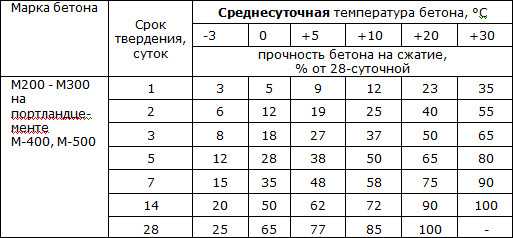 Процент прочности бетона от марочной в зависимости от температуры и времени