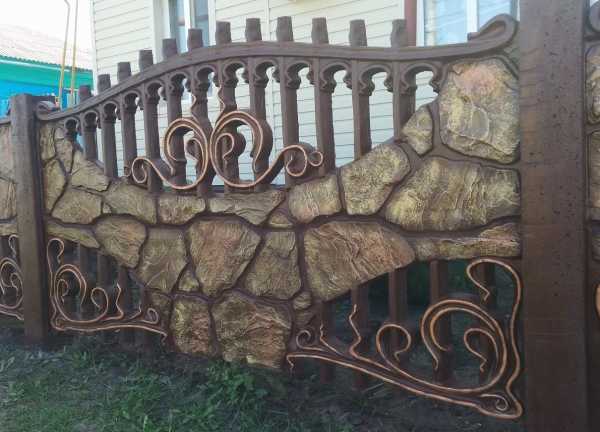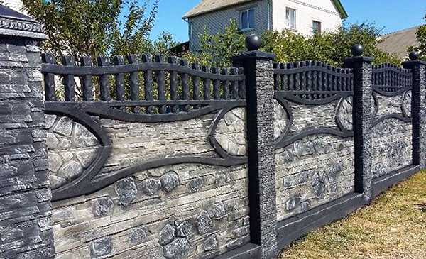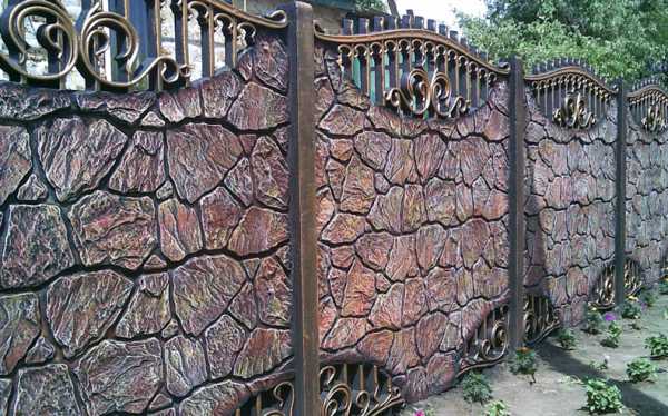 Сегодня встречаются наборные заборы, обрамленные железной оправой. В этом случае бетон совмещается с самыми разными материалами: