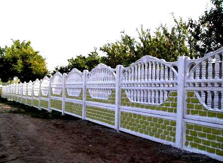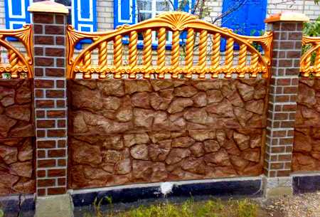 Декоративные ограждения выполняются в самых разных стилях и цветовых гаммах. При помощи декоративного бетонного литья умельцы создают прочные и эстетичные композиции, которые прекрасно сочетаются с другими материалами – деревом, ажурной ковкой из металла, природным камнем. Фирмы-изготовители предлагают множество вариантов, выполненных под кирпичную кладку, камень различных фактур. Бетонное литье с успехом имитирует балюстраду и даже деревянную вагонку. Декоративные бетонные заборы пользуются большим спросом при огораживании частных владений, где в первую очередь требуется солидность и респектабельность.