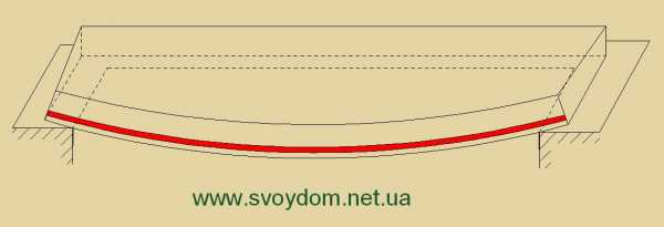 Как видно из рисунка, когда плита изгибается, ее нижняя часть растягивается, и арматура при этом подхватывает это напряжение растяжения, т.к. бетон на это не способен. Бетон без арматуры при изгибе будет только трещать и разрушаться. При малейшем изгибе нам нужно устанавливать арматуру, которая будет брать растягивающие напряжения изгиба на себя.