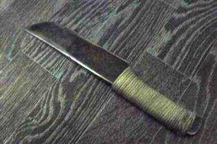 Самое простое и доступное, на мой взгляд – отрезные алмазные диски по камню и бетону. Их основная часть состоит из стали х12 или 100х12 в российской ножевой маркировке. Эта сталь прекрасно закаливается, отжигается и обладает всеми положительными свойствами такой же по углероду обычной стали (У10). Также нет проблем с уковкой по толщине, т.к. диски обычно не толще 3 мм. Обратная сторона медали – наличие слабой токсичности этой стали. Дело в том, что для достижения свойств нержавейки необходимо 13% хрома, в этой стали его меньше. Если после шлифовки нож из этой стали вытереть насухо, то он не заржавеет. Но, с другой стороны, опустите его в горячий чай, и лезвие мигом покроется чем-то невразумительно темным. Это окись хрома, которая, в общем-то, канцероген. Для ножей походных, рабочих, боевых эта сталь идеальна, но на кухне ей делать нечего, и прежде чем отрезать таким ножом себе колбасы стоит подумать. Полубоевой нож из этой стали: