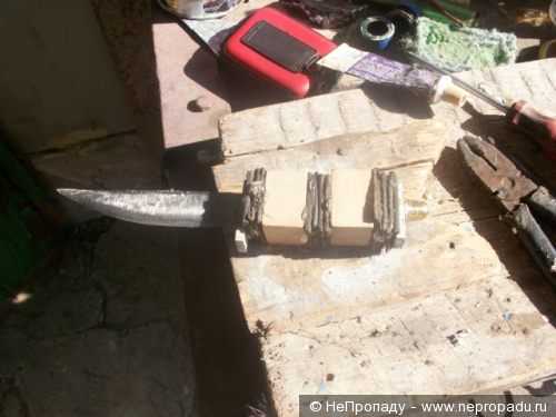 Настает самый ответственный и тяжелый этап в изготовлении ножа, ведь от него будут зависеть все режущие данные. Для формирования скосов вам понадобится надежно закрепленный брусок и пару саморезов. Приложите заготовку к бруску и прикрутите ее двумя саморезами. Теперь, вооружившись напильником, можете потихоньку формировать скосы. Не спешите и следите за тем, чтобы скосы были ровными.