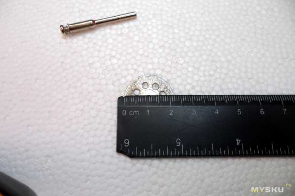 С оправкой так же все в порядке. Она ровная, симметричная. Во время работы не бьет, диск восьмеркой не ходит. Диаметр части, устанавливаемой в «патрон» — 2,7 миллиметра.