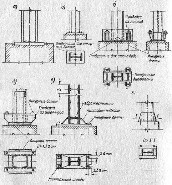 База колонны служит для распределения сосредоточенного давления от стержня колонны по площади фундамента и обеспечивает закрепление нижнего конца колонны в соответствии с принятой расчетной схемой.