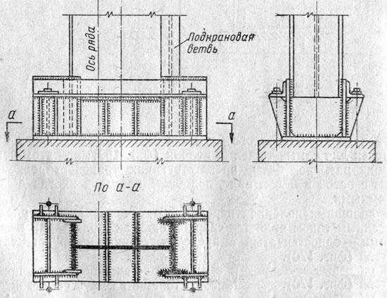 Некоторое применение нашли также базы подкосного типа. Существенным недостатком такой базы являются ее малая жесткость, а также коробление опорной плиты в результате усадки швов, прикрепляющих листовые подкосы.