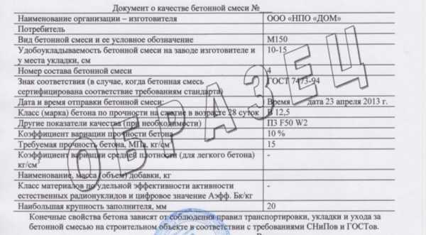 Обязательно необходимо требовать от производителя сертификат и паспорт на бетонную смесь. Это поможет защитить себя в следующих случаях: