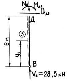 Изгибающий момент М5 в любой точке по всей длине стержня равен нулю, так как к стержню приложена только одна внешняя сила Vв, линия действия которой совпадает с его осью, а, следовательно, плечо силы Vв равно нулю.