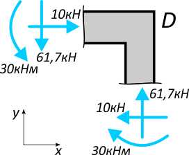 — на вертикальной части – отрицательная сила величиной 10кН, следовательно, по правилу знаков стремится повернуть узел против хода часовой стрелки;