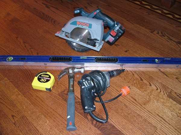 Итак, для монтажа полотен и выравнивания пола понадобятся следующие инструменты: