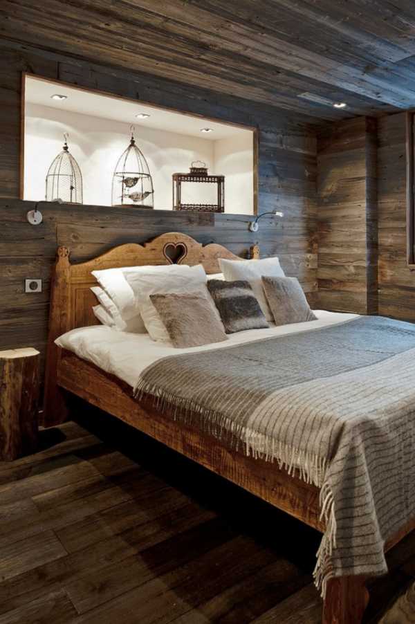 Пример спальни, выполненной с использованием деревянных обоев гусварблок