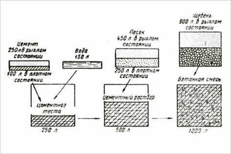 Водно–цементное соотношение — основной показатель (оптимальное соотношение 0,4 в массовой пропорции), нарушение которого приводит к недобору прочности материалом на несколько классов, тем более к последнему ведет добавление воды в уже готовую композицию. Подобная операция только внешне увеличивает подвижность замеса, но через короткое время заметным становится его расслоение. Соотношение компонентов создает определенную способность удержания воды в смеси. Ее подвижность изначально можно регулировать количеством воды. В малоподвижным смесях, считающихся наиболее выгодными, ее объем незначительный, что требует применения машинного трамбования для заполнения пустот в опалубке (при литье лестниц, фундаментов).