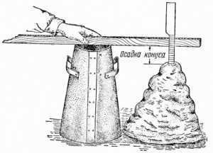 Прибор для испытаний на осадку конуса — усеченный металлический конус с воронкой, упорами и ручками (читайте также статью «Алмазная чашка по бетону – ее виды и особенности»).