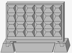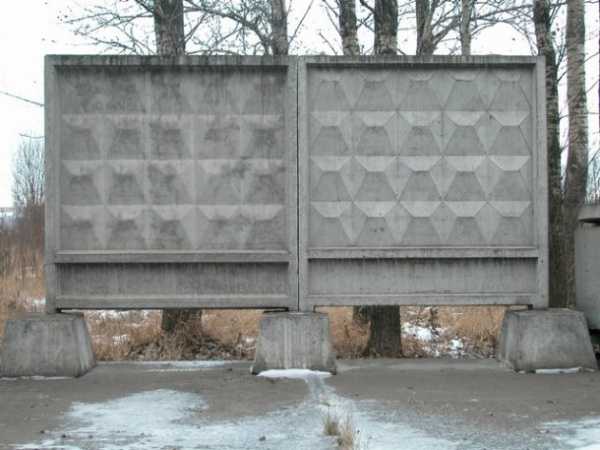 Он состоит из массивных плит ПО-2 серого цвета, установка которых происходит с помощью подъёмного крана. Такой вид забора не требует наличия фундамента, он вставляется в специальные литые стаканы, которые надёжно удерживают его.