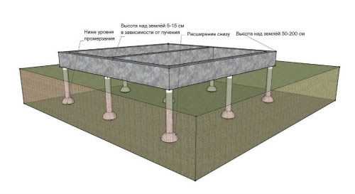 Строительные требования предусматривают минимальную высоту бетонного слоя, который должен возвышаться над поверхностью грунта не меньше, чем на 15 см. Это позволяет оптимально размещать сетку для армирования. Сетка нужна для укрепления нижней части бетонной подушки, которая испытывает силы растяжения. Они передаются от фундамента, испытывающего весовую нагрузку всего сооружения.