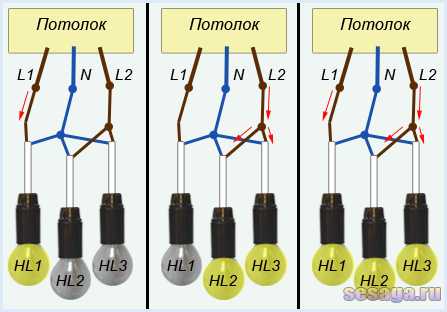 Схема работает так: при нажатии, например, левой клавиши, фаза L1 поступает на коричневый провод лампы HL1 и лампа загорается. При включении правой клавиши фаза L2 одновременно поступает на коричневые выводы ламп HL2 и HL3 и лампы загораются. При нажатых обеих клавишах выключателя горят все три лампы. Ноль для всех ламп общий.