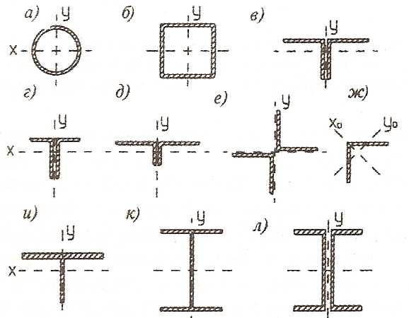 Рис. 11. Типы сечений стальных ферм: а) трубчатые; б) прямоугольное гнутозамкнутое; в,г,д,е) из парных уголков; ж) из одиночных уголков; и) из тавров — для поясов ферм; к,л) то же, из двутавра или двух швеллеров