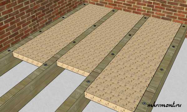 Перед началом монтажа на расстоянии 0,2 м устанавливаются маяки с ориентацией на нулевую отметку, выставленную при помощи уровня. Лаги представляют собой деревянные бруски, которые укладывают на основу. В тех местах, где наблюдаются большие перепады высоты, под них устанавливают столбики разной высоты, регулируя уровень прокладками. Между стенами и черновым полом обязательно нужно оставлять промежуток в 1-2 см для свободной деформации материала.