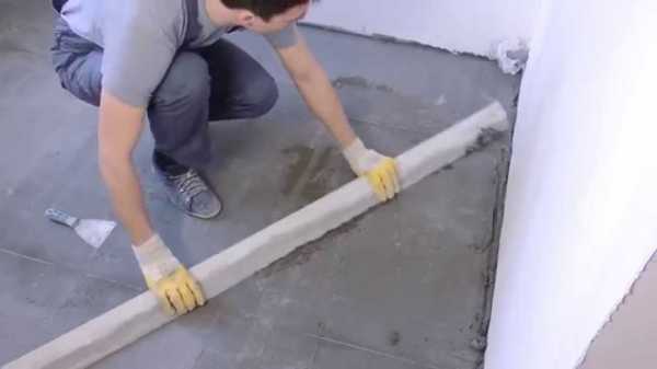 Если уровень пола больше 3 см, то лучше использовать бетон, а если меньше 3 см, то можно ограничиться цементно-песчаным раствором. При этом следует помнить, что высота стяжки менее 3 см может оказаться не надежной (детальнее: «Как делать стяжку пола – 7 этапов монтажа своими руками»). Все зависит от толщины финишного покрытия.Затем, четко по отметкам выставляются маяки.