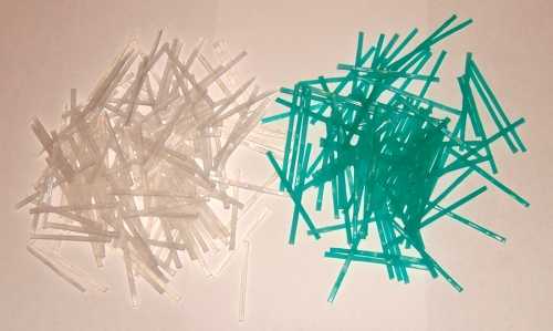 - Фибра стеклянная. Этот вид используется только для отелочных и декоративных работ, так волокна быстро становятся хрупкими и не способны выдержать большую нагрузку в бетонных конструкциях. При добавлении этих стекловолокон в раствор значительно экономится расход цемента и воды – на 15 и 20% соответственно. Расход на один квадратный метр бетона – в среднем один килограмм.